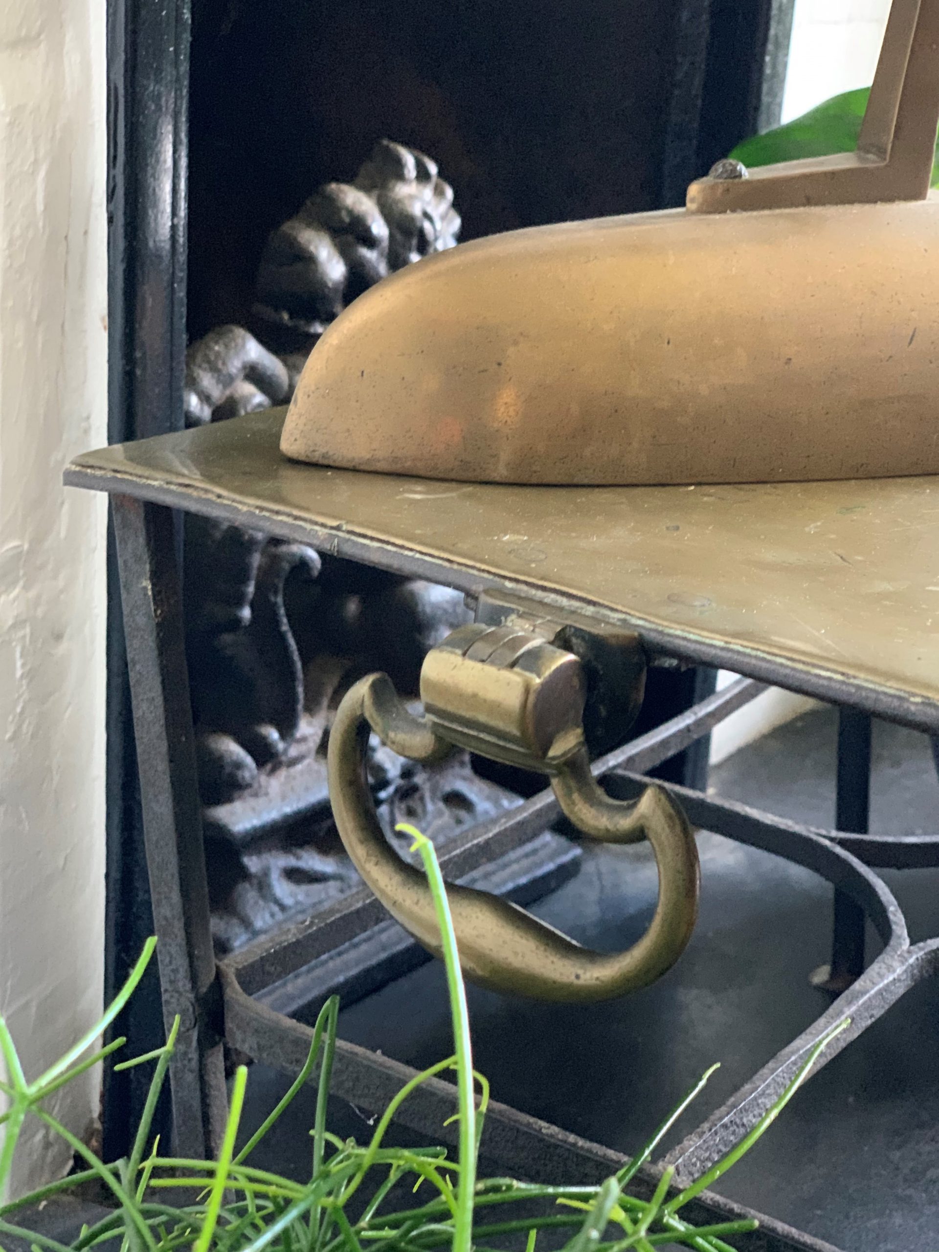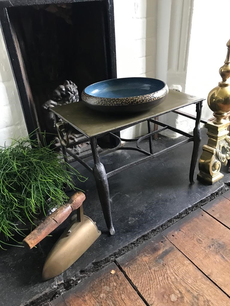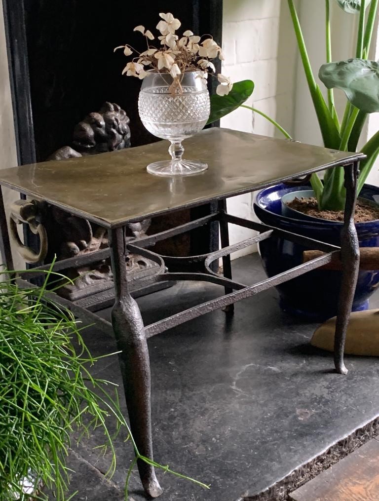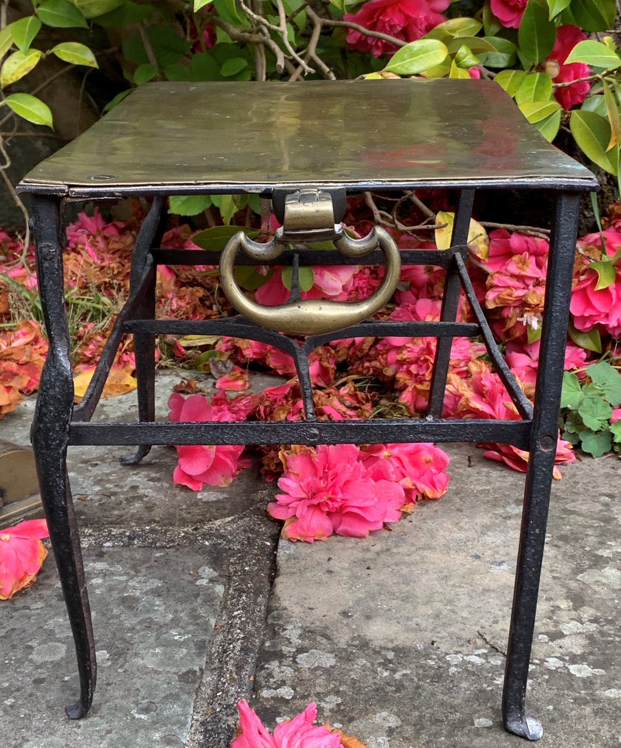 A hand forged 19th Century Brass and Iron Footman/Trivet. It is very Arts & Crafts in style and features a brass plate standing on black iron legs with a decorative wrought iron under tier with delightful and tactile handles.