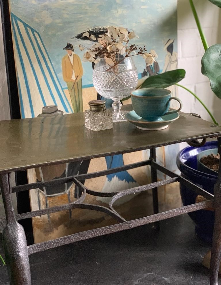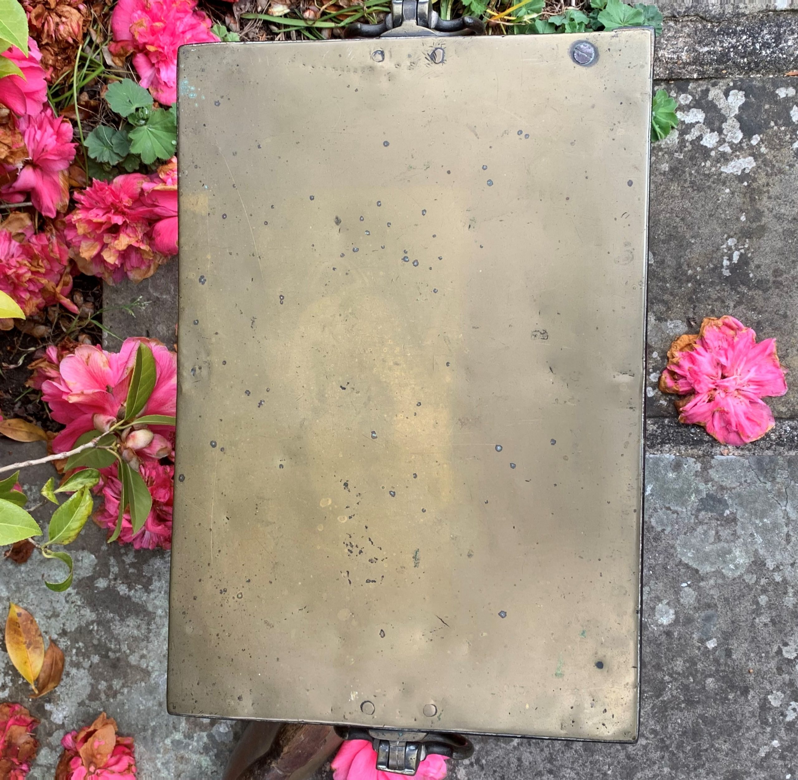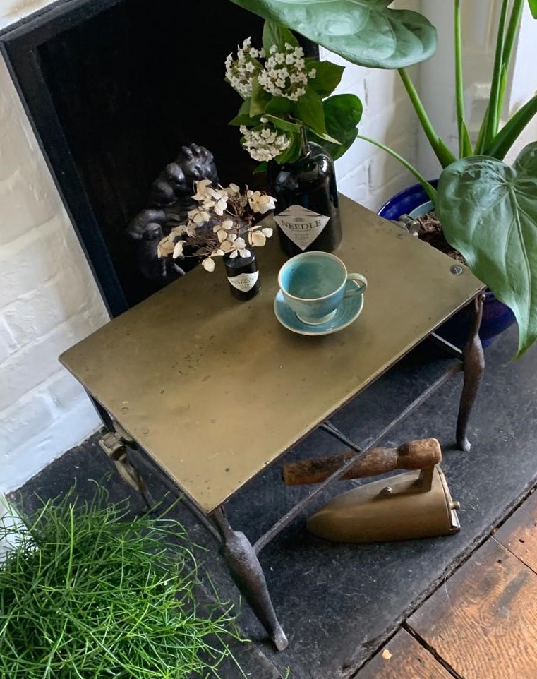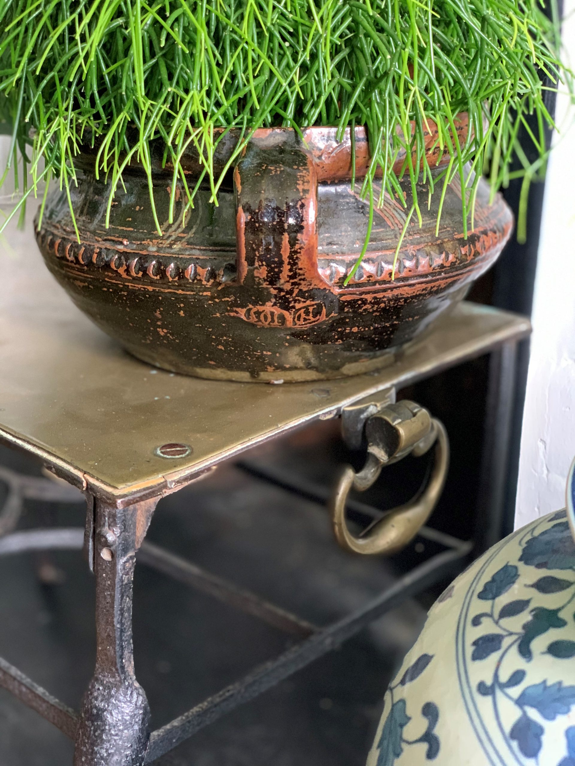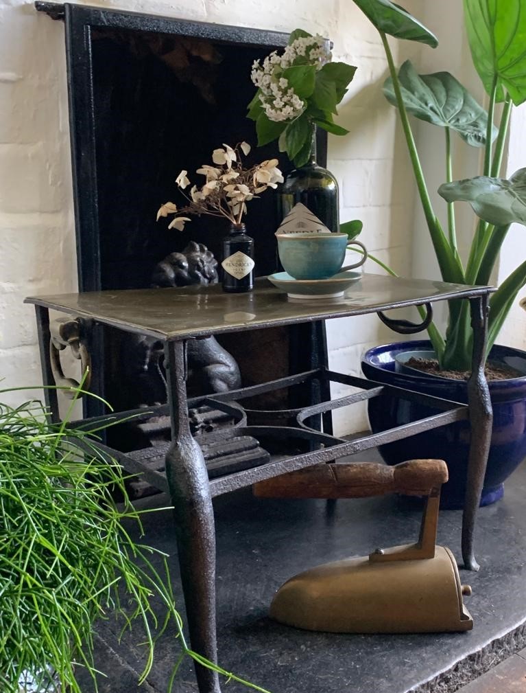 A hand forged 19th Century Brass and Iron Footman/Trivet. It is very Arts & Crafts in style and features a brass plate standing on black iron legs with a decorative wrought iron under tier with delightful and tactile handles.
