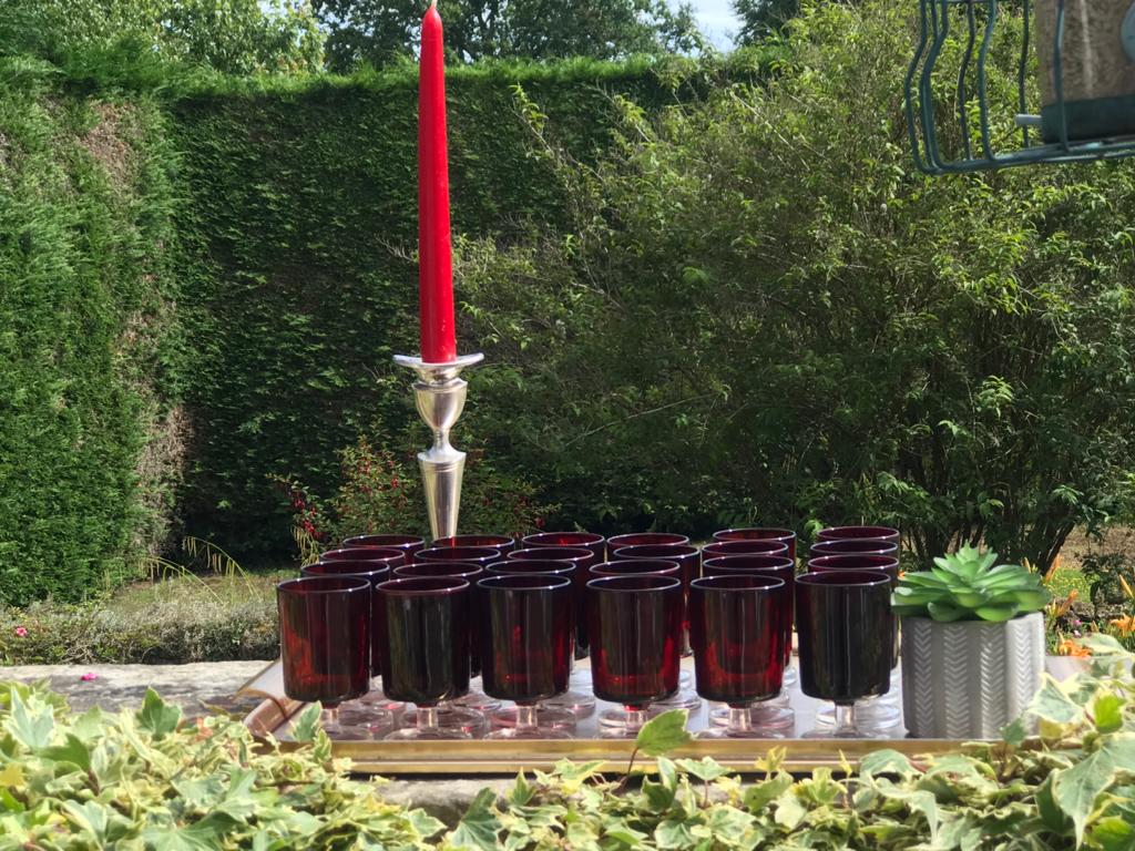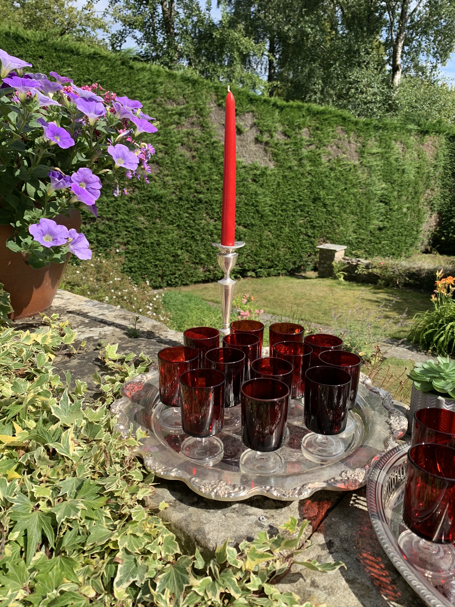 These Sherry/Shot/Aperitif Cranberry Glasses have clear stems. They can be used for drinks or for desserts or simply to hold a single stem flower as part of a display.