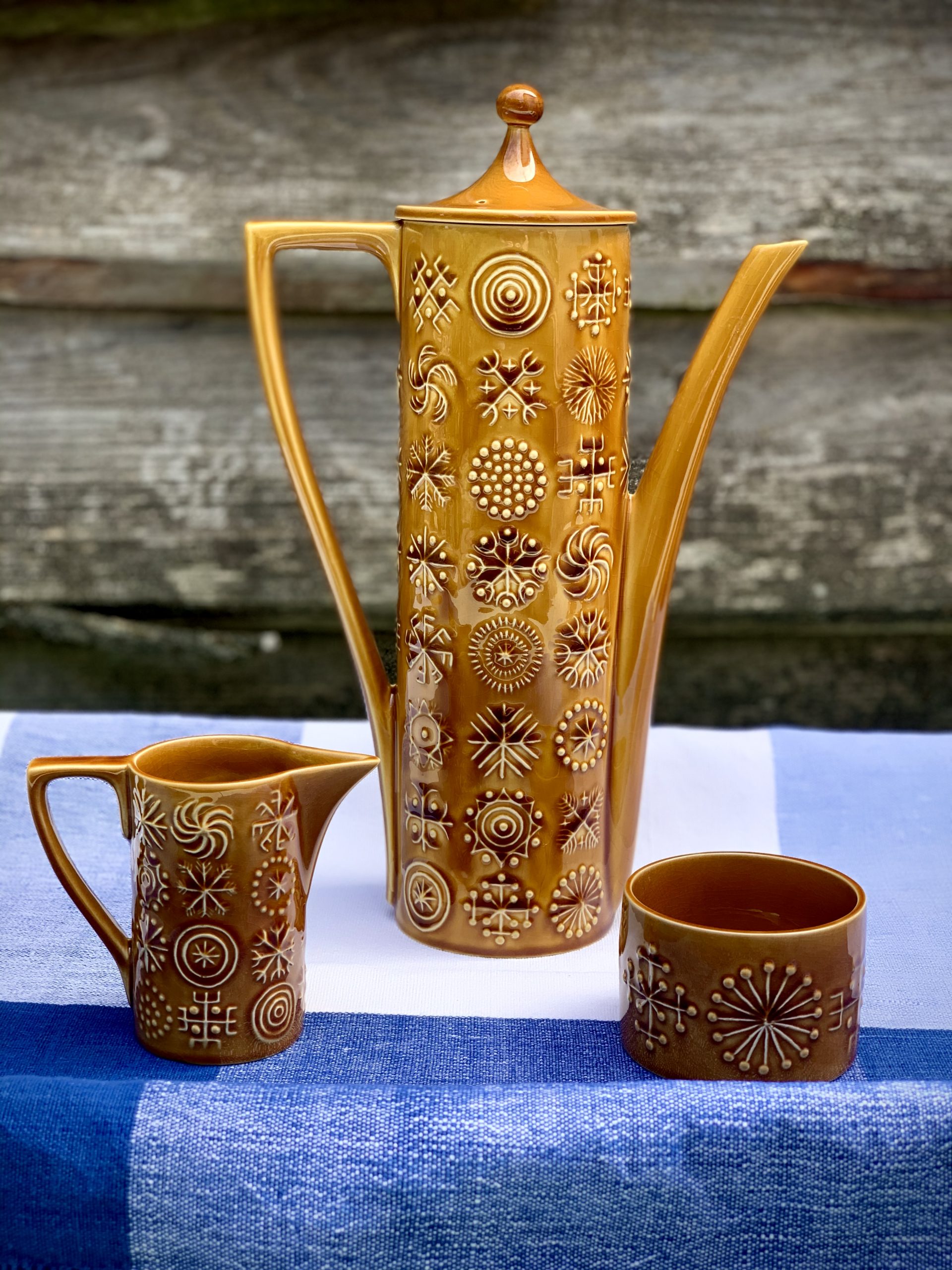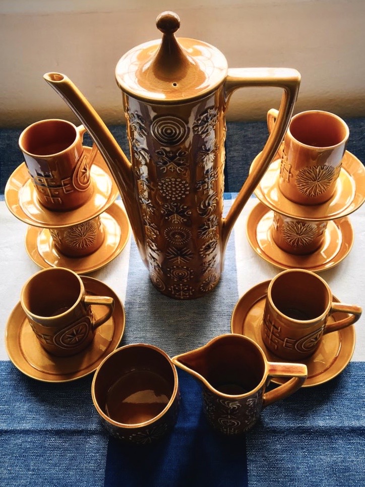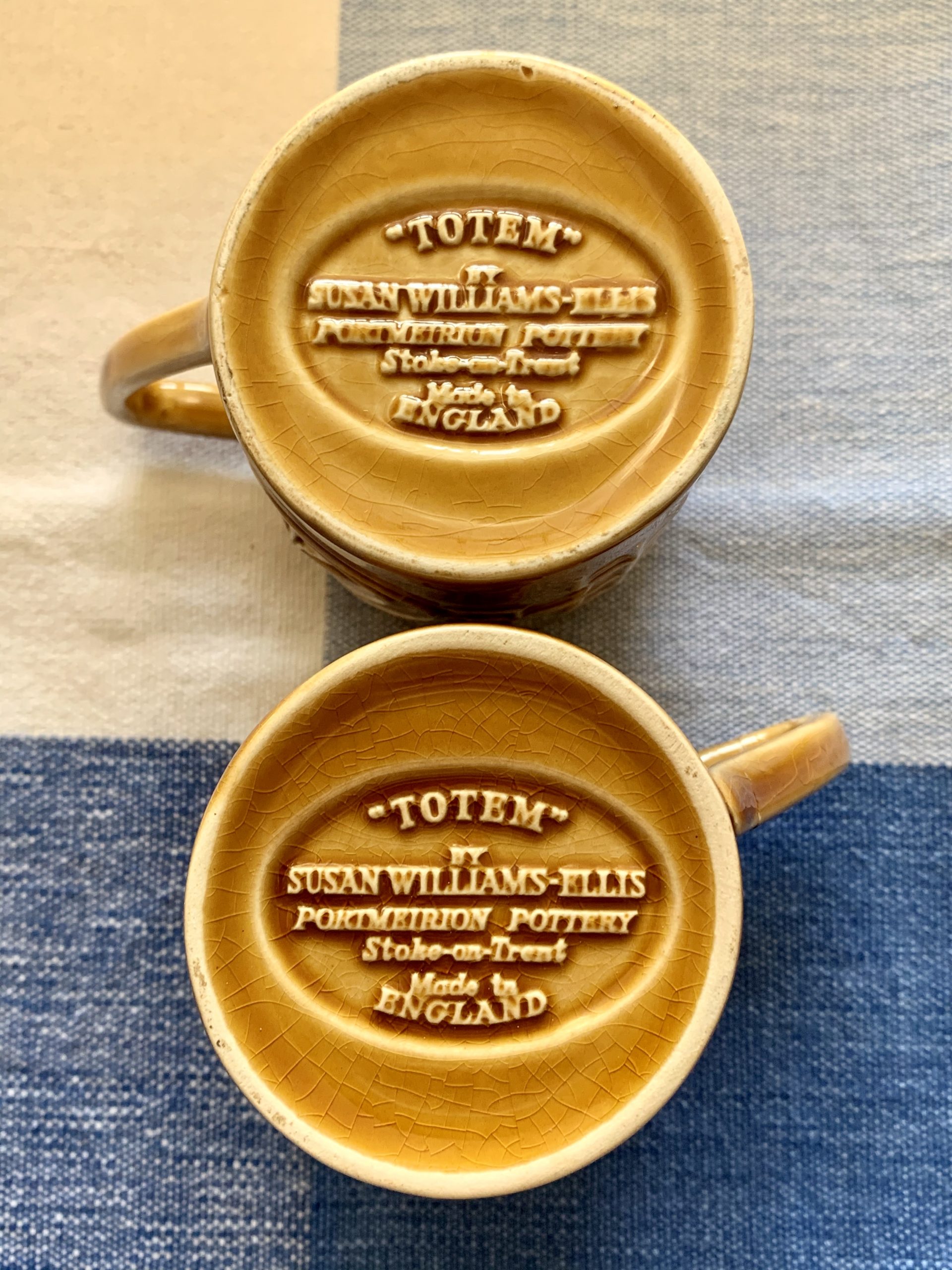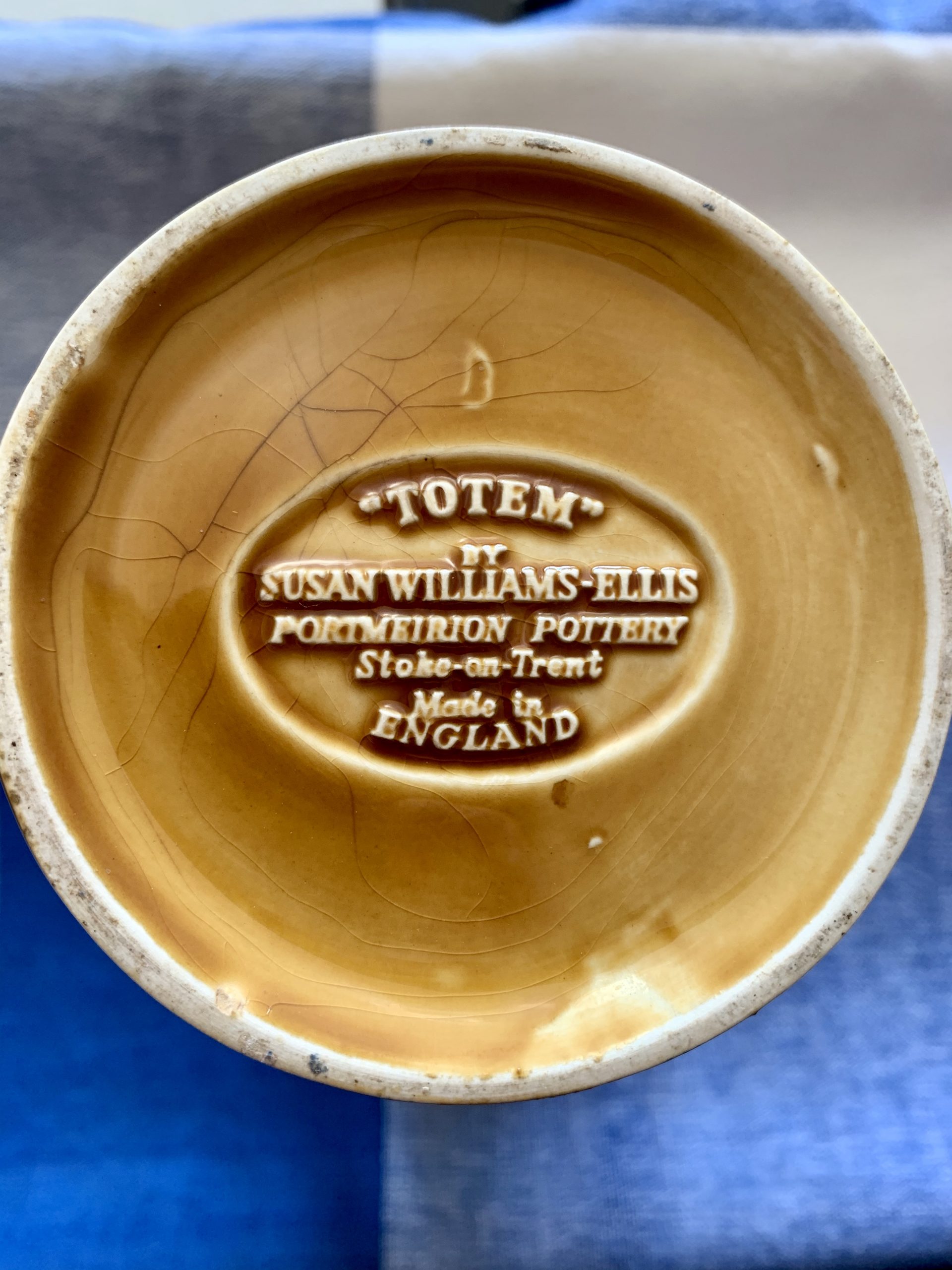 This is an Amber Totem coffee service by Susan William-Ellis for Port Meirion Pottery.  This is possibly one of the most iconic designs by Susan Williams-Ellis and was launched in 1963.  This design (Totem) is on display in museums both in the UK and Internationally and was produced in a number of colours including Amber, Olive Green, Sage Green and Blue amongst others.
