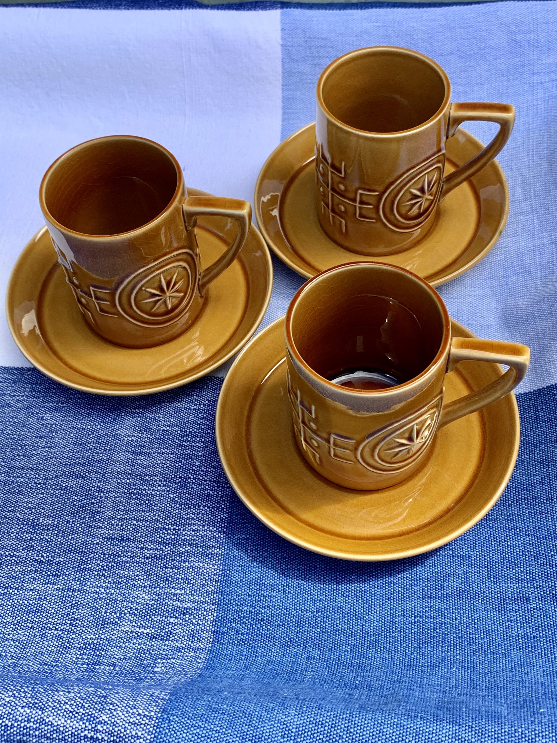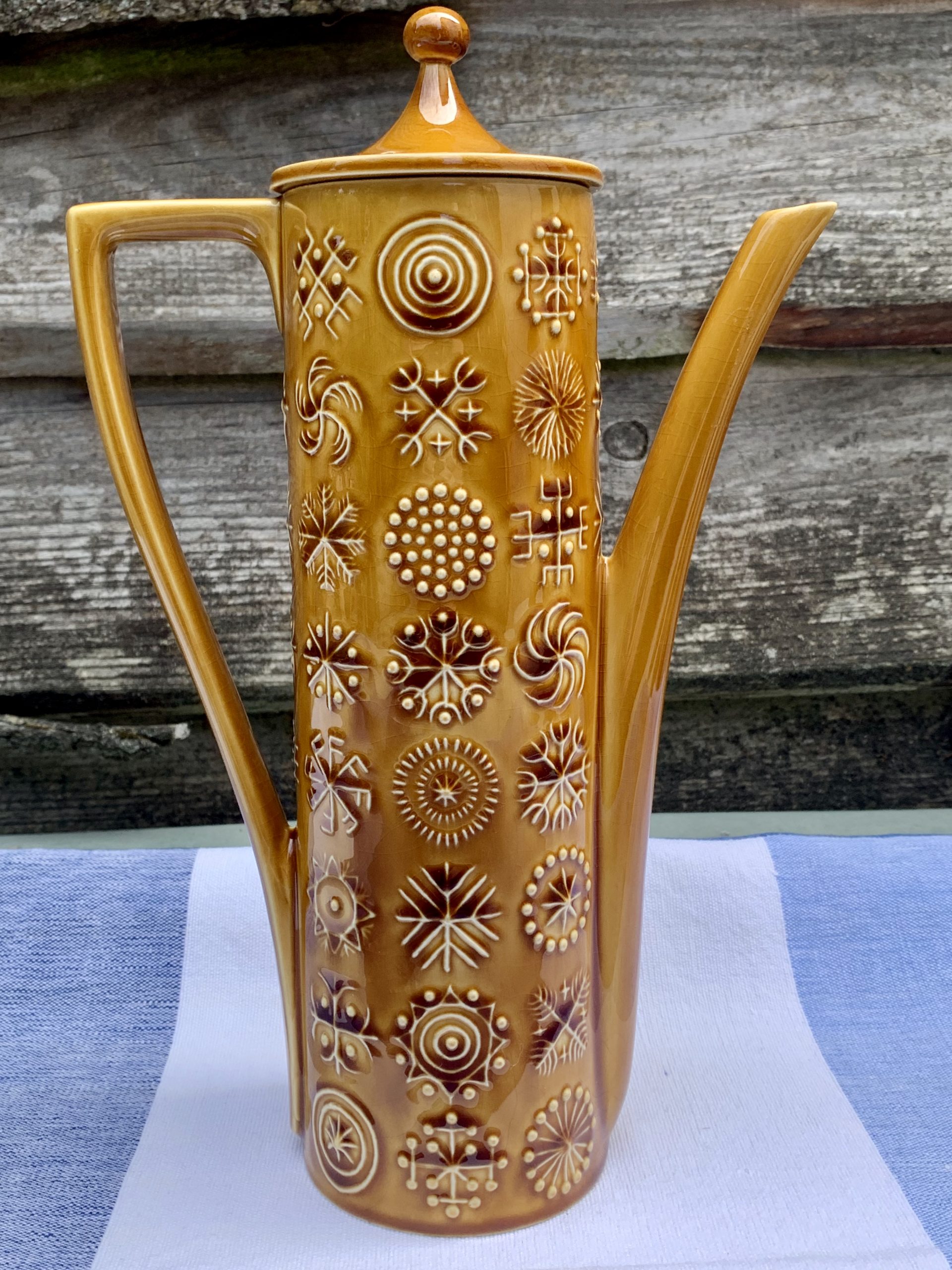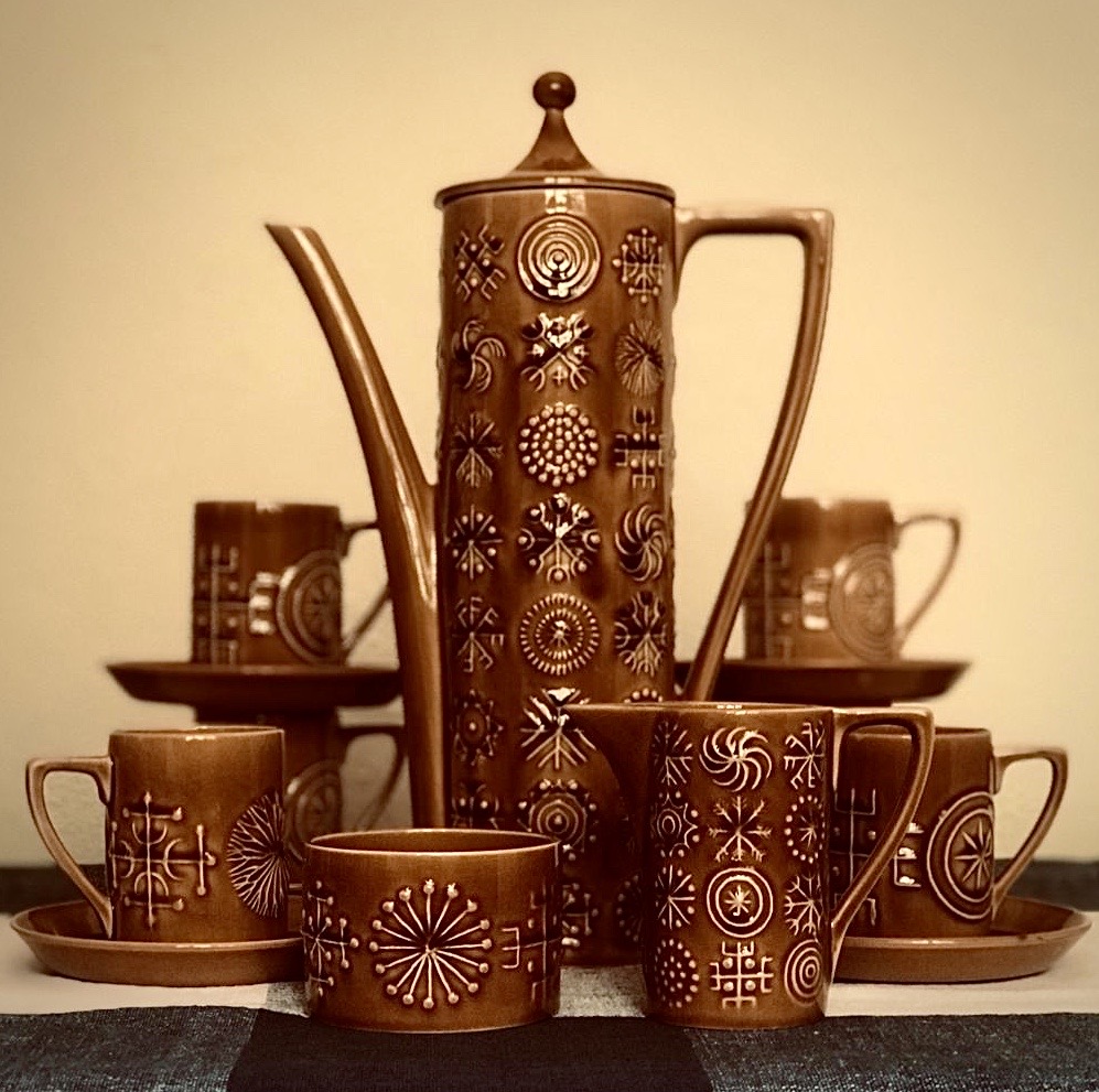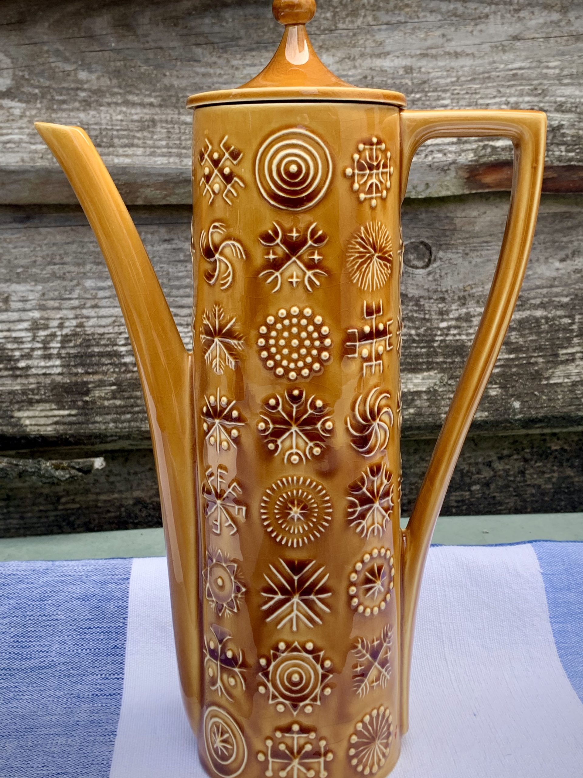 This is an Amber Totem coffee service by Susan William-Ellis for Port Meirion Pottery.  This is possibly one of the most iconic designs by Susan Williams-Ellis and was launched in 1963.  This design (Totem) is on display in museums both in the UK and Internationally and was produced in a number of colours including Amber, Olive Green, Sage Green and Blue amongst others.