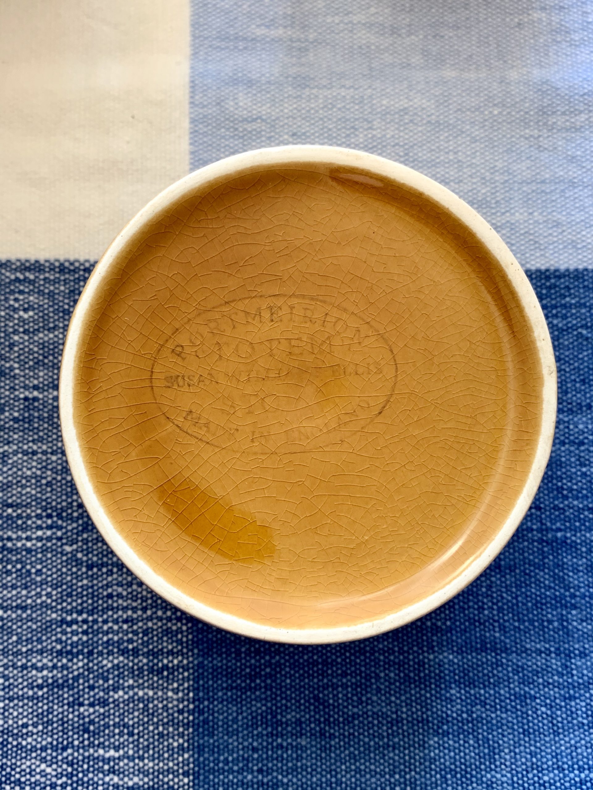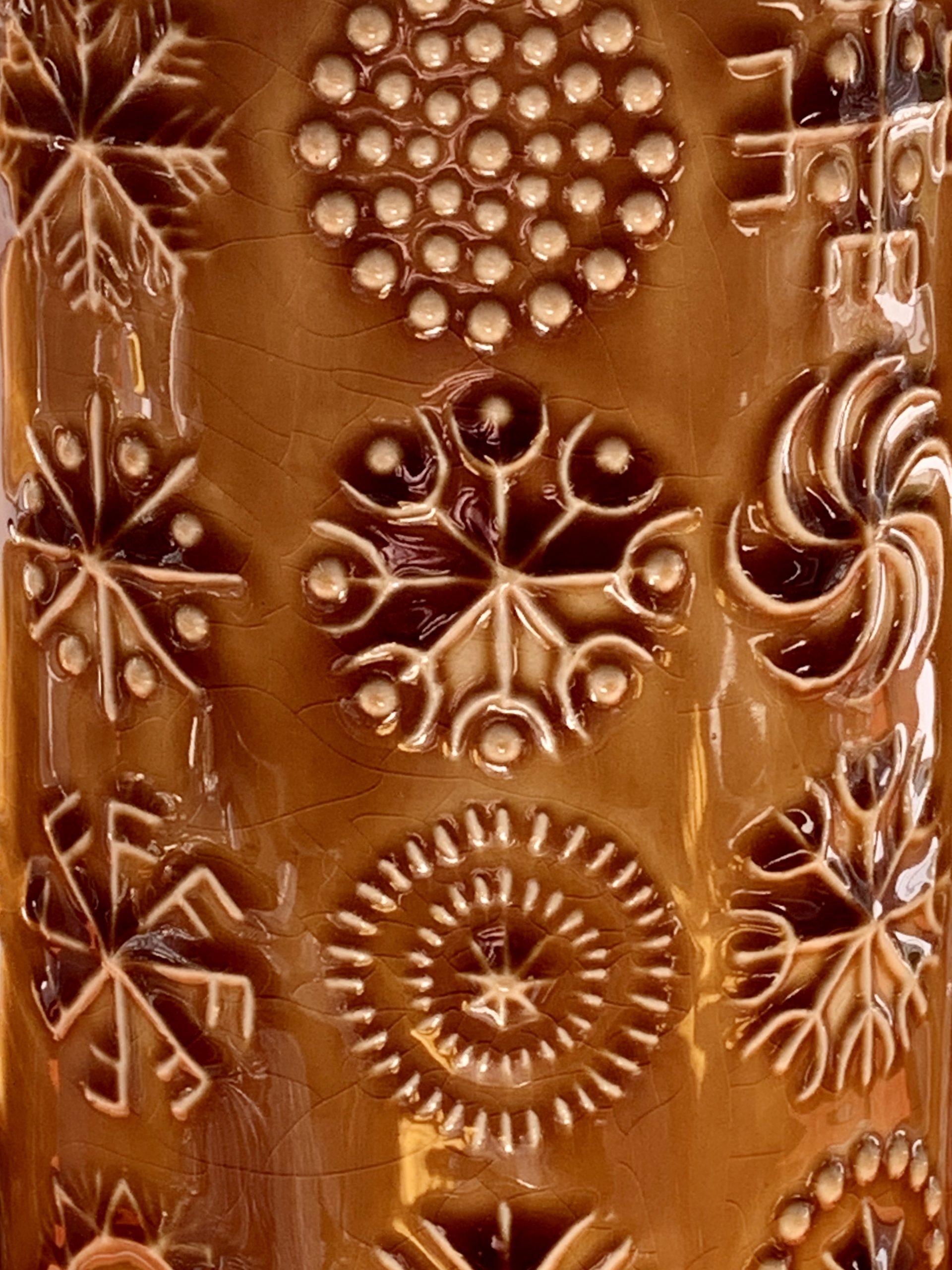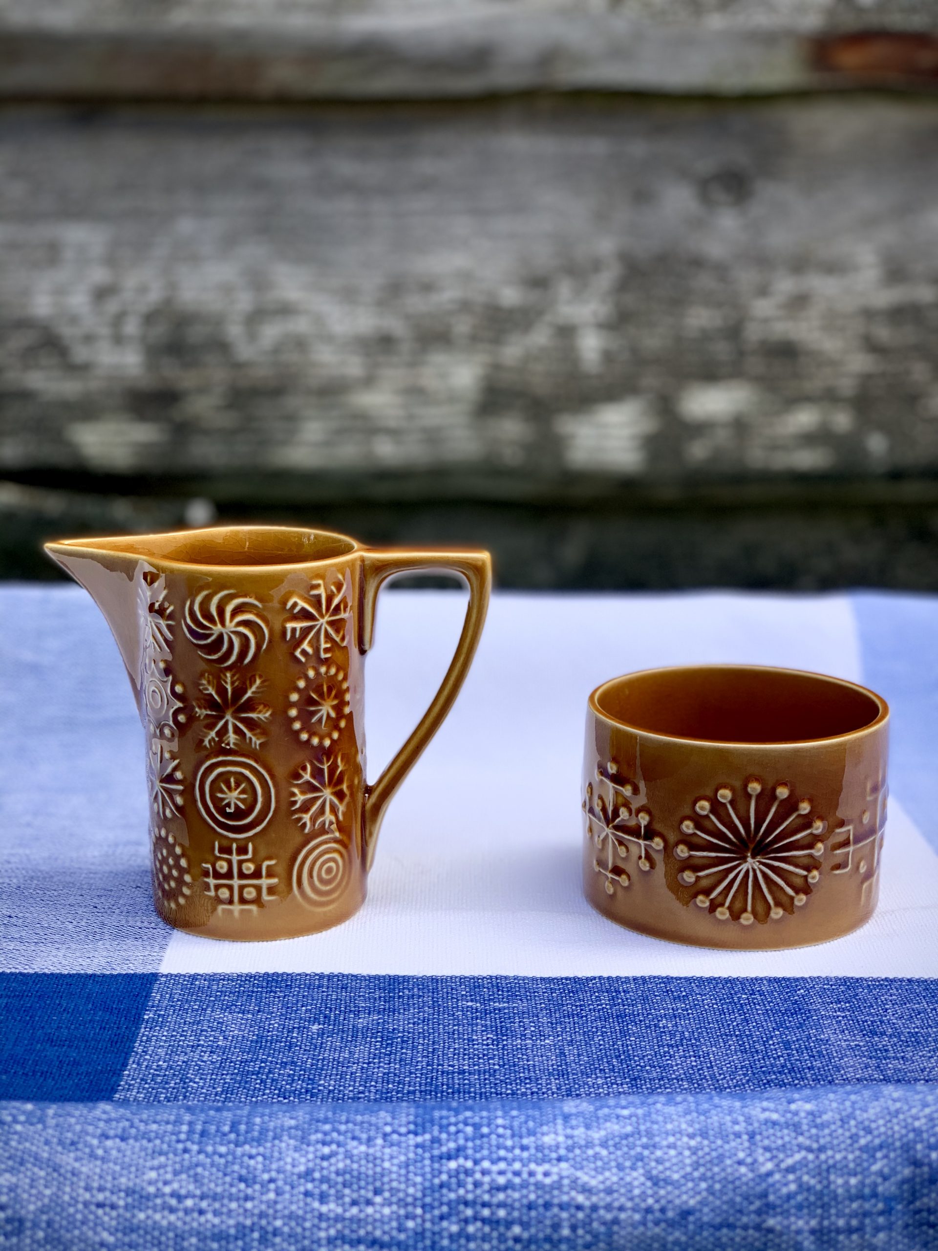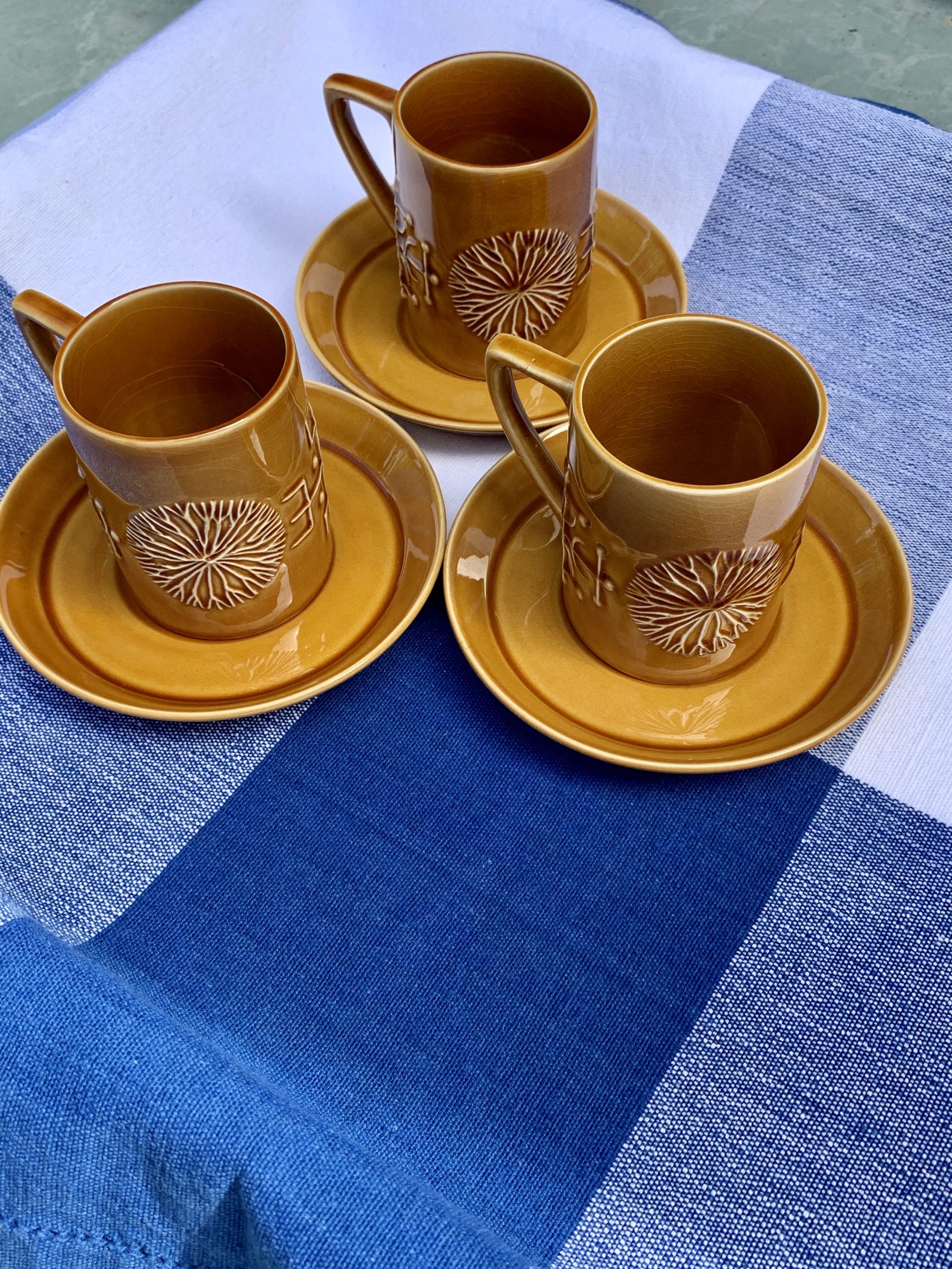 This is an Amber Totem coffee service by Susan William-Ellis for Port Meirion Pottery.  This is possibly one of the most iconic designs by Susan Williams-Ellis and was launched in 1963.  This design (Totem) is on display in museums both in the UK and Internationally and was produced in a number of colours including Amber, Olive Green, Sage Green and Blue amongst others.