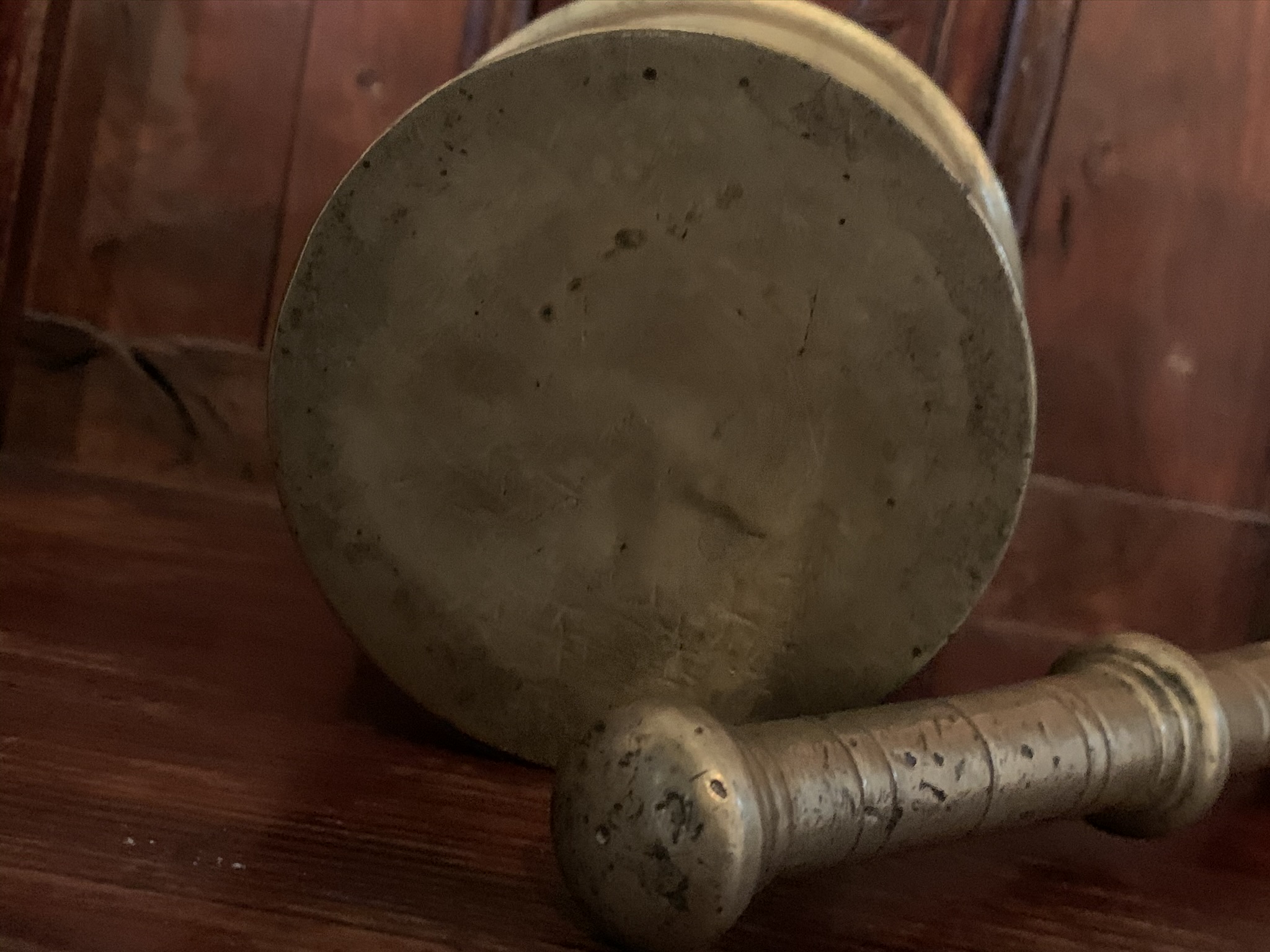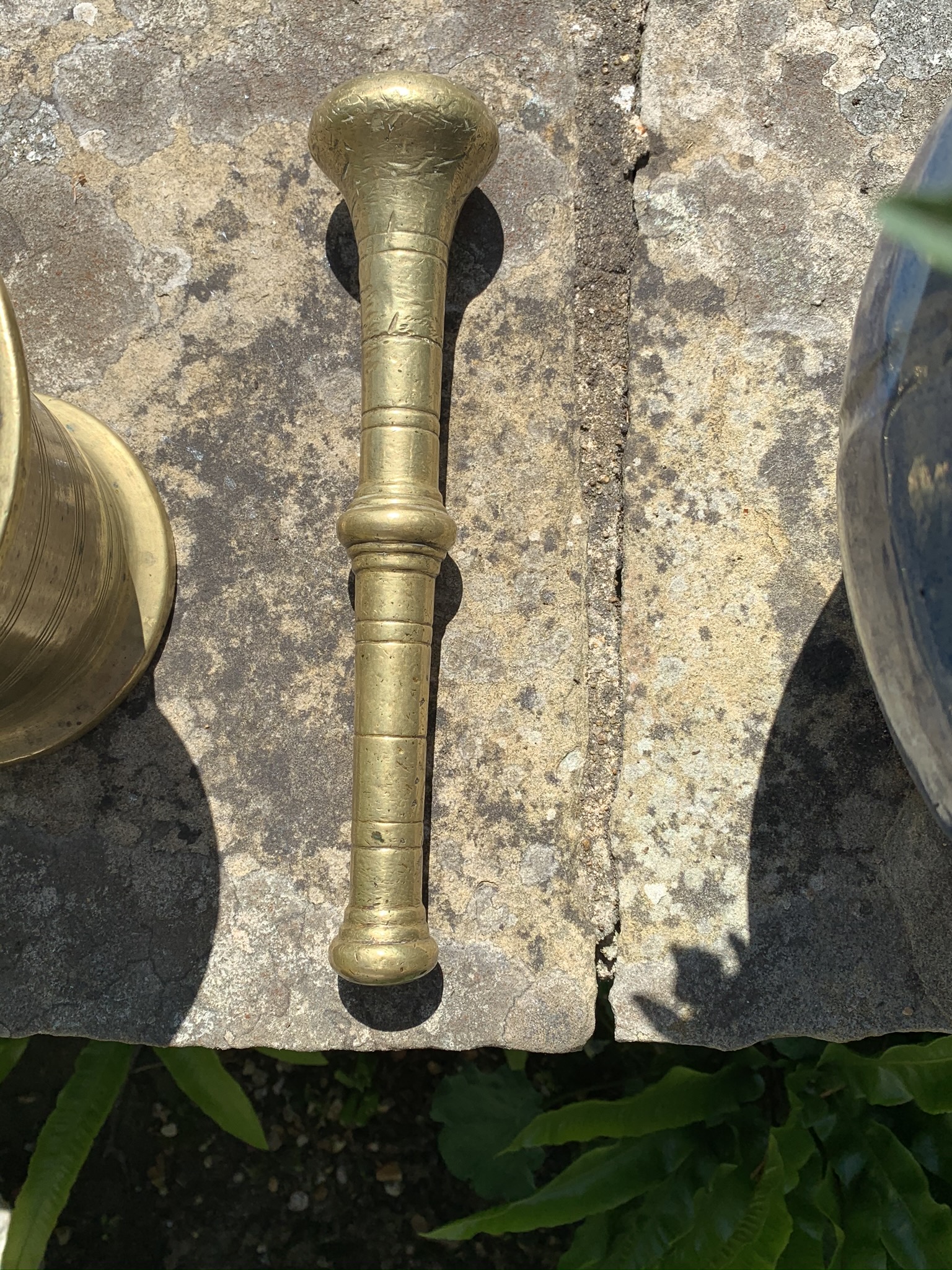 A very heavy Antique Brass Apothecary Pestle and Mortar in good condition with a beautiful patina. Marks, scratches and wear all over from age and use. Some dings around the rim and to the pestle – please see photos.