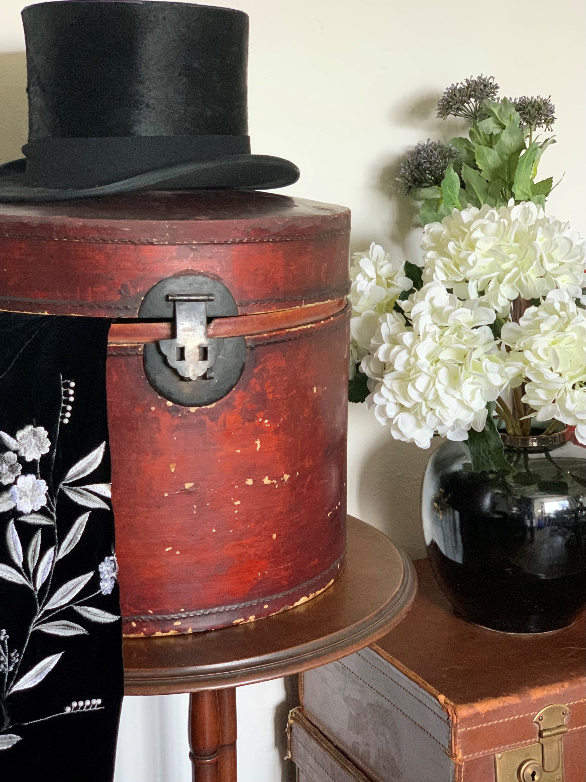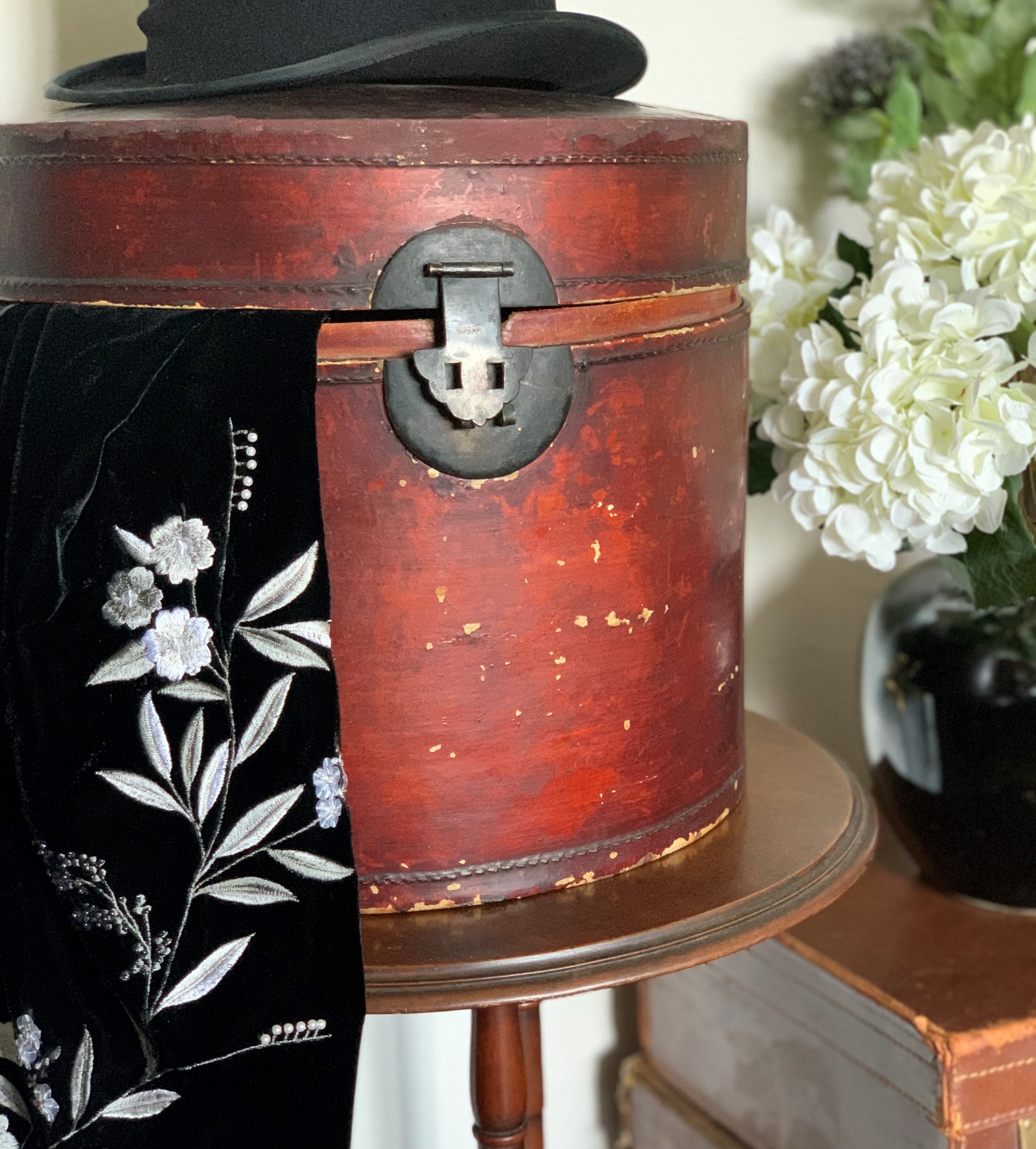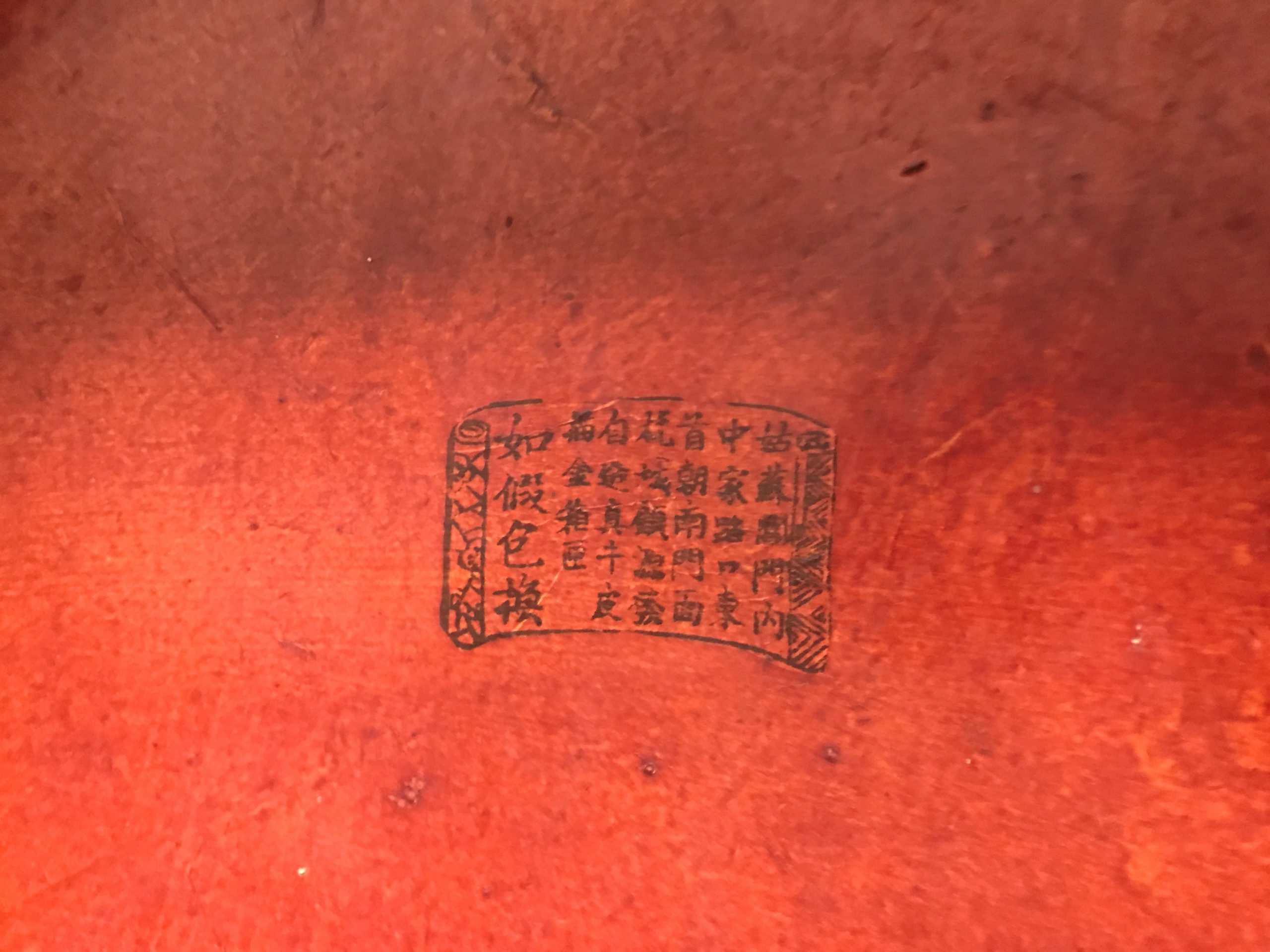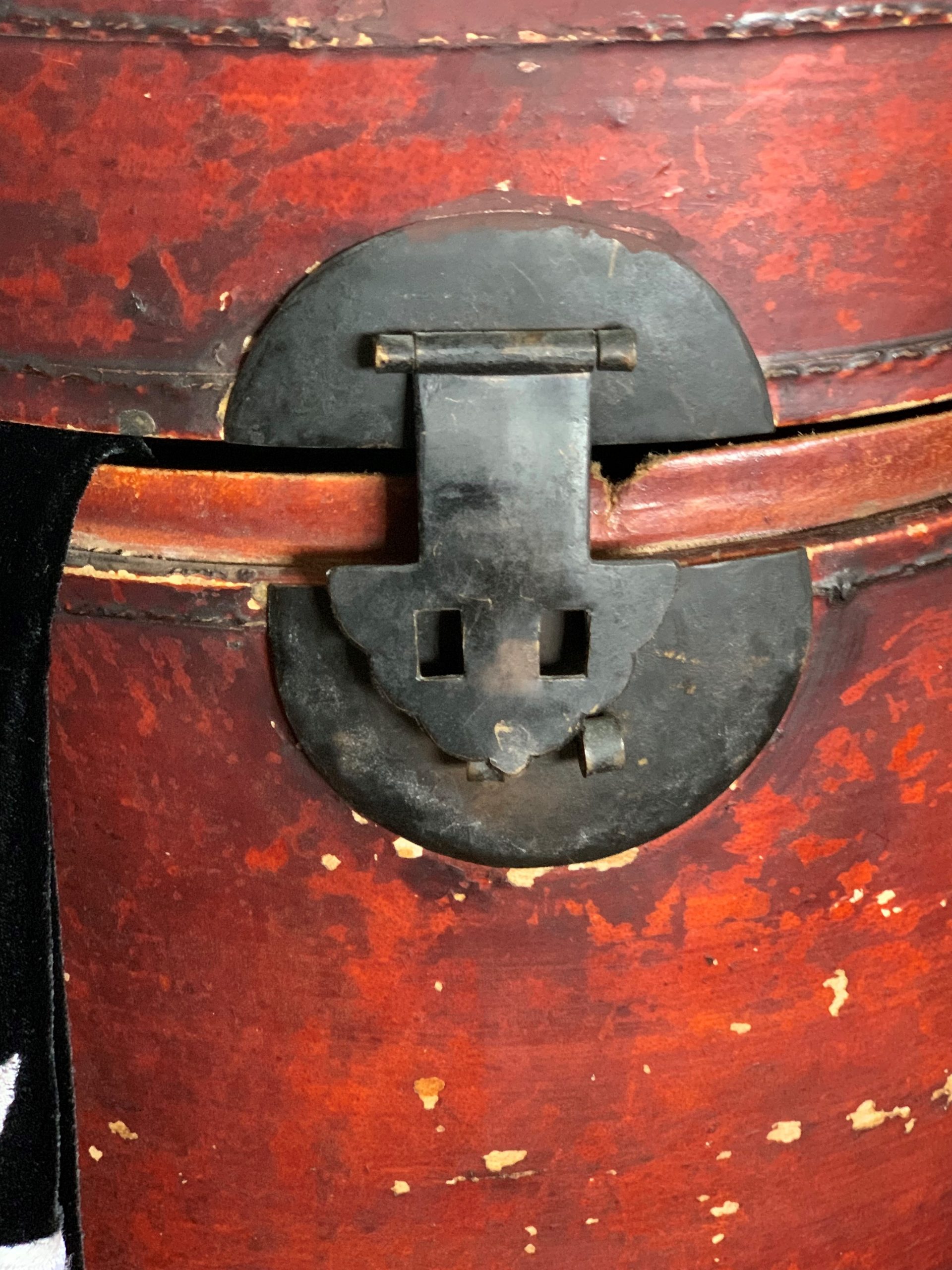 This handsome 19th century hat box is time worn and has dings and marks which is in keeping with it’s age and use over the years. It is sturdy and sound overall and features a Chinese ink stamp on the inside of the lid.