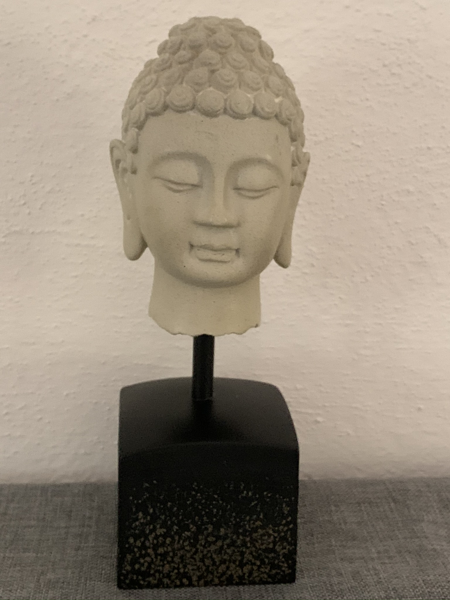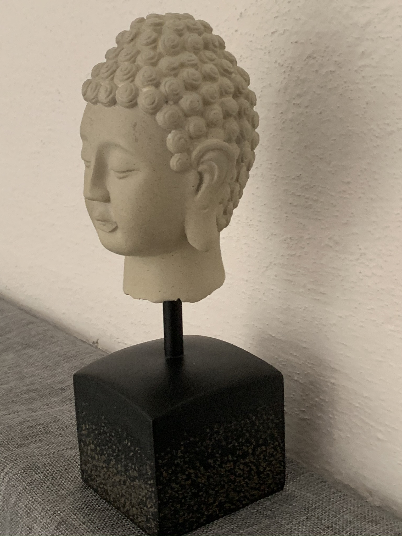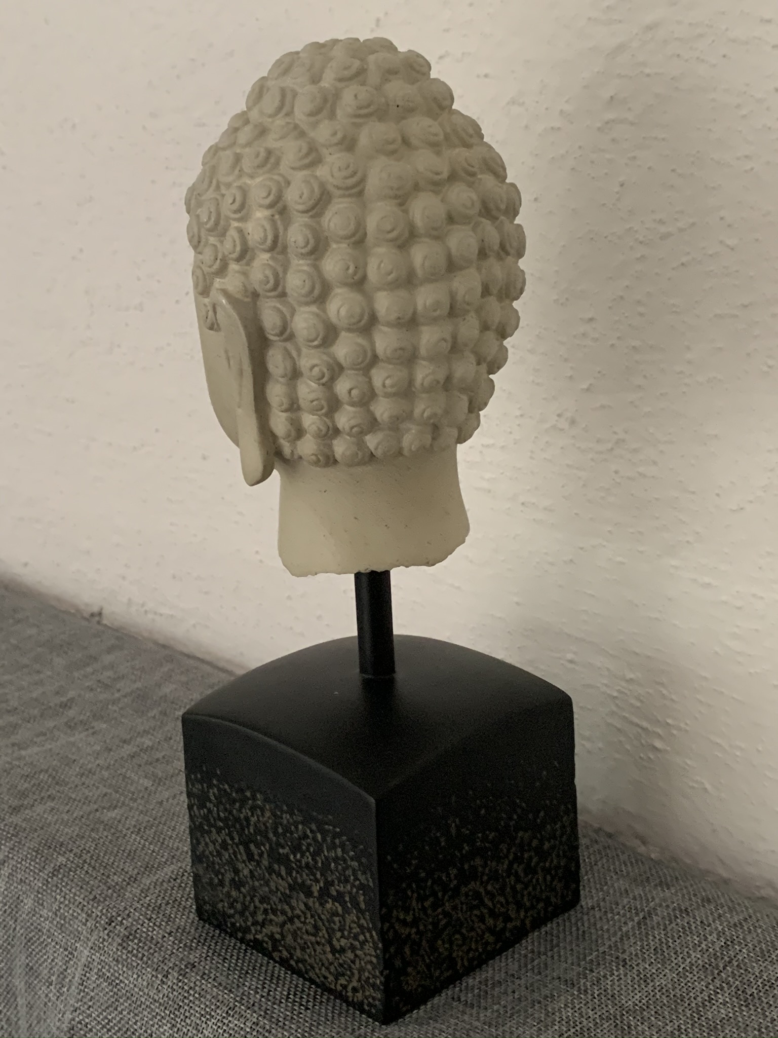 A Carved Stone Effect coloured Buddha Head on Plinth