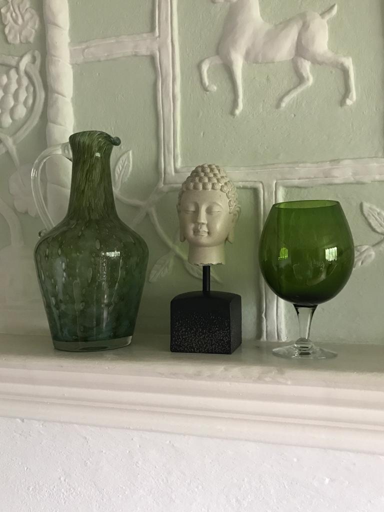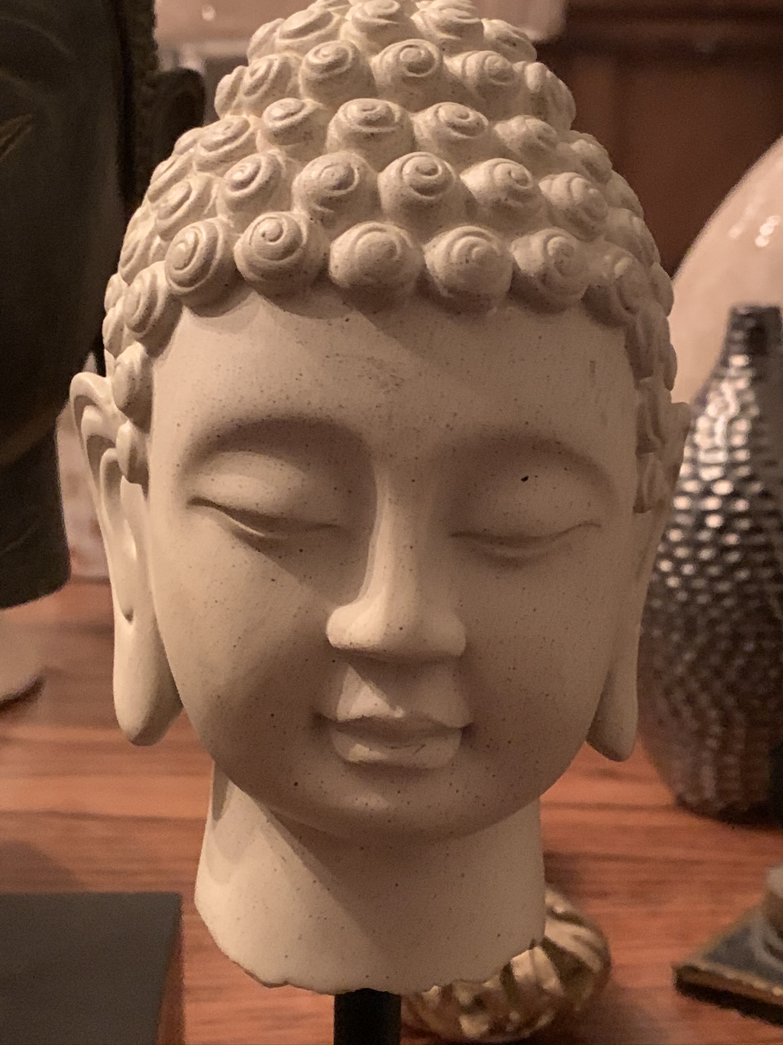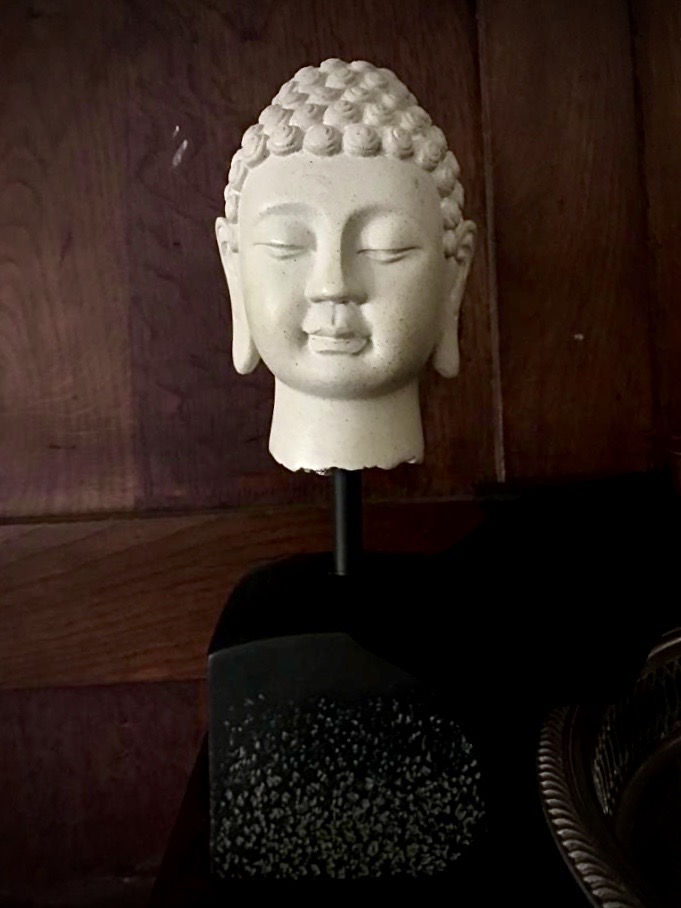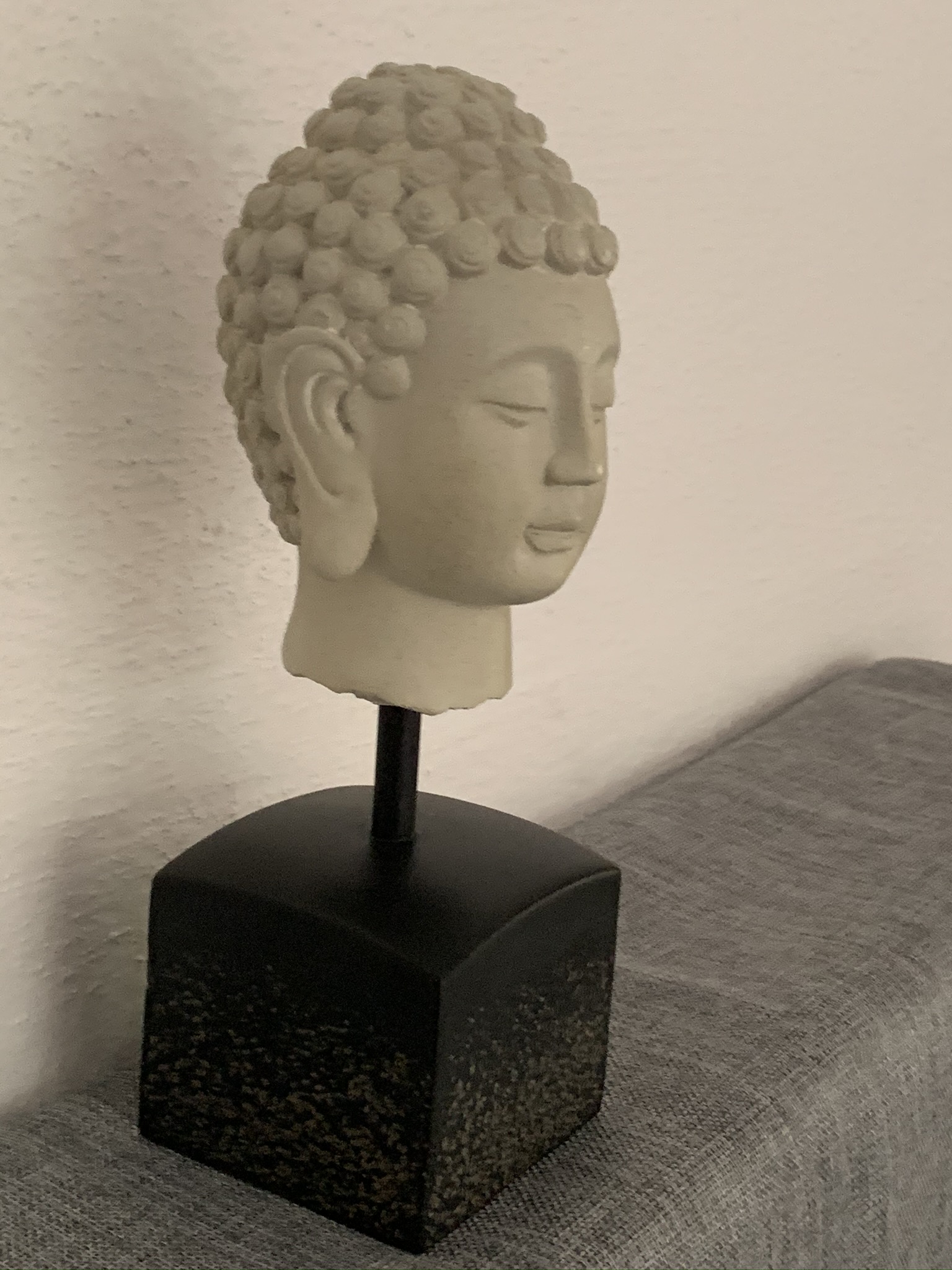 A Carved Stone Effect coloured Buddha Head on Plinth