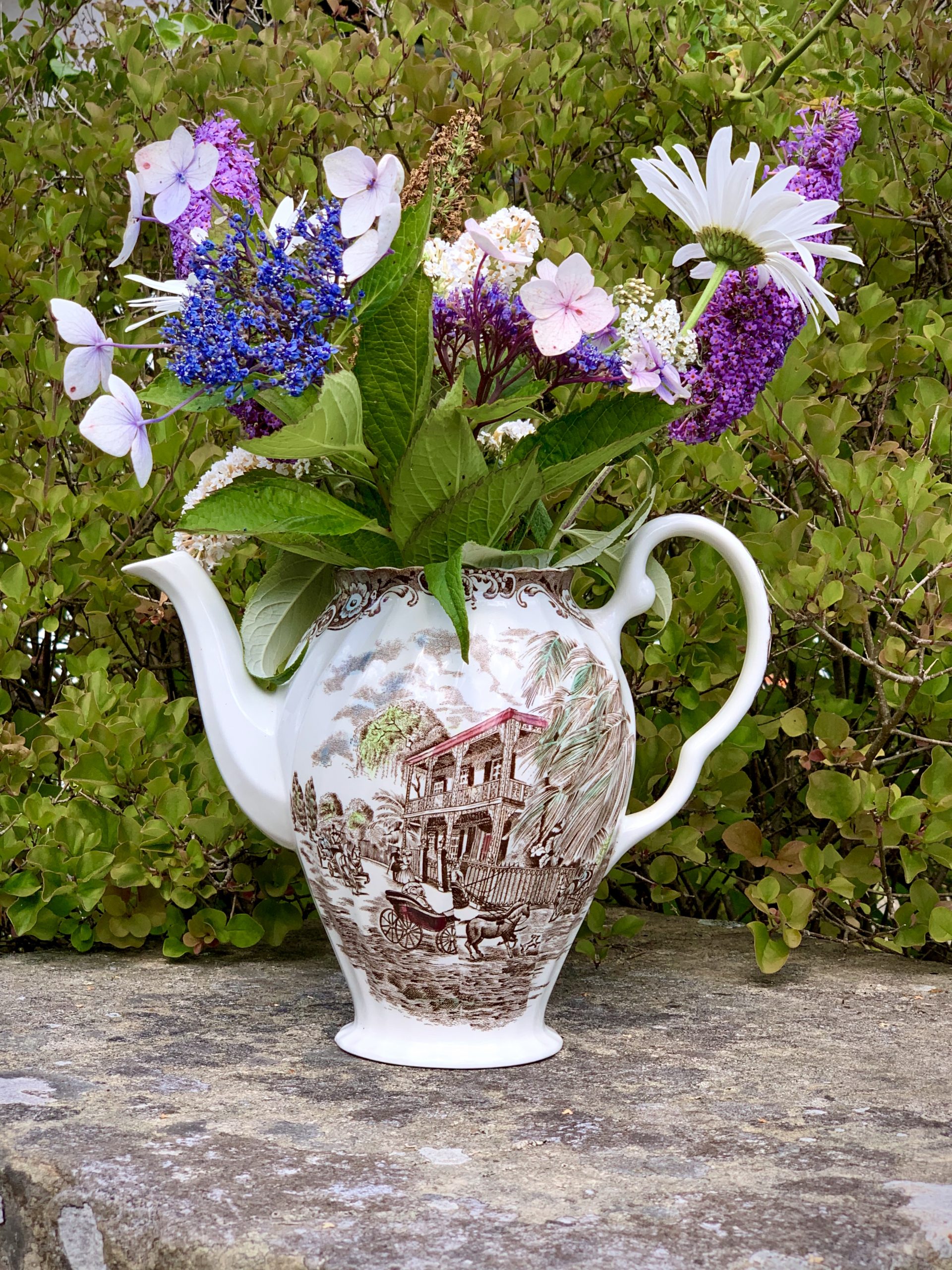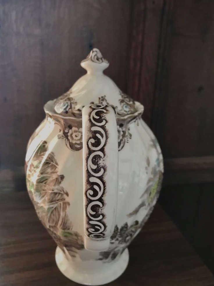 This elegant coffee pot is the Johnson Brothers Heritage Hall French Provincial Brown/Multicolour design. It is in excellent condition and was manufactured between 1969-1985.